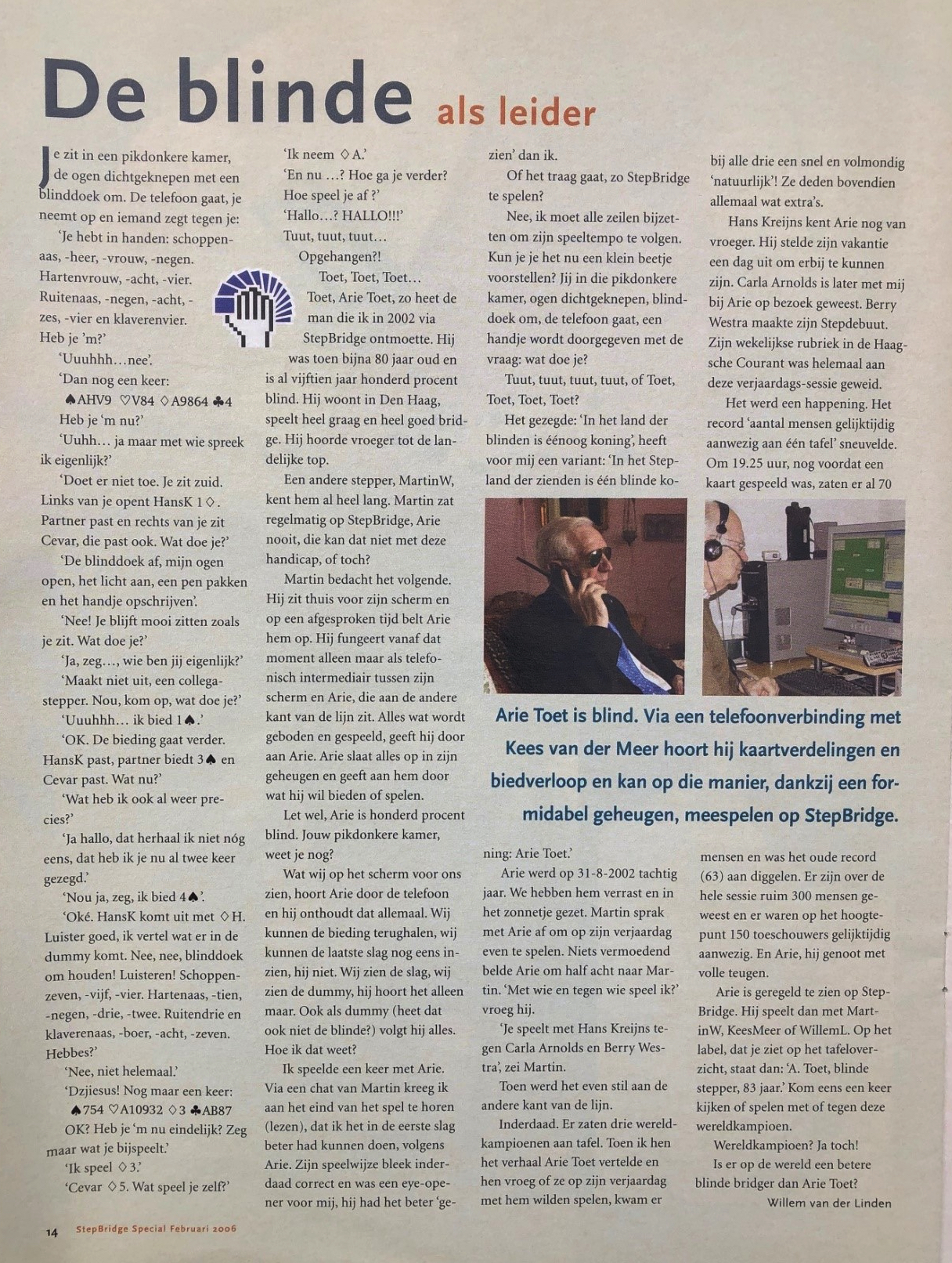 In het kader van twintigjarig jubileum werden enkele leden van het eerste uur geïnterviewd. Ik was er daar een van. Een van de standaard vragen was “wat is het mooiste dat je hebt meegemaakt op StepBridge”. Er waren voor mij veel hoogtepunten. Niet zozeer als speler, maar meer in dingen die ik voor SB heb gedaan. Had ik een lastige keus? NEEN!! Er is een ding dat voor mij op afstand nummer 1 staat. De kennismaking met Arie Toet. Die naam zegt de meesten van jullie helemaal niks. Toch heeft hij een onuitwisbare indruk op mij gemaakt. Ik heb 15 jaar geleden een artikel over hem geschreven in het Bridgeblad. Dat artikel lees je in de bijlage.